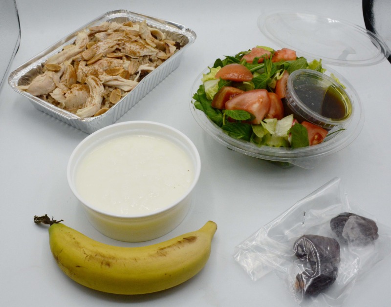 من طبق رئيسي، فتوش أو لبن، معجنات، حلويات أو فاكهة، عصير، تمر.
